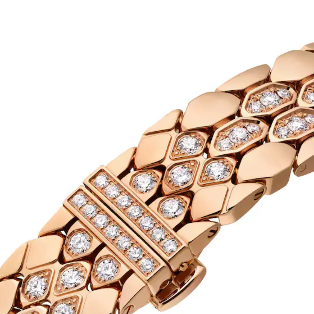 Gleaming with the refined sheen of its materials, the Serpenti Seduttori watch in  rose gold and stainless steel makes time even more precious. Reimagining Bulgari’s icon of seduction with a striking new design, the timepiece boasts the distinctive drop-shaped watch head set with diamonds and a black lacquered dial. Inspired by the scales of a serpent, the sensual and flexible bracelet features a hexagonal pattern, conjuring up the glamour of jewellery through a captivating aesthetic. Serpenti Seduttori watch with quartz movement, 33 mm stainless steel case, rose gold bezel set with 38 round brilliant-cut diamonds,  rose gold crown set with a cabochon-cut pink rubellite, black lacquered dial, stainless steel and  rose gold bracelet with folding buckle. Water-resistant up to 30 metres.