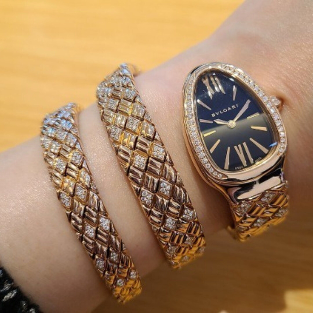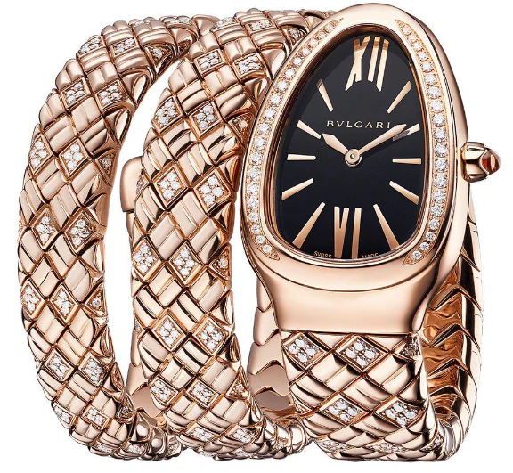 The BVLGARI Serpenti Spiga Lady watch is a dazzling celebration of boldness and elegance. It seamlessly fuses the fearless spirit of the Serpenti collection with the timeless sophistication of Spiga, which translates to spike in Italian. The watch’s drop-shaped case showcases an aura of luxury with its rose gold form and an extravagant array of round brilliant-cut diamonds. The bezel is set with 38 brilliant-cut diamonds, while the cabochon-cut rubellite crown injects a vibrant splash of colour. The black dial, contrasted sharply with Roman numerals and rose gold-plated hands, adds a dramatic flair to this stunning piece. The double-spiral bracelet is a visual marvel, reflecting the infinite elegance of the serpent and paying homage to ancient Roman designs with its abstract wheat stalk pattern. Powered by the precise quartz movement and protected by scratch-resistant sapphire glass, this watch doesn’t just dazzle with its beauty; it offers enduring functionality and durability. Make your mark with the exquisite elegance of the BVLGARI Serpenti Spiga Lady watch